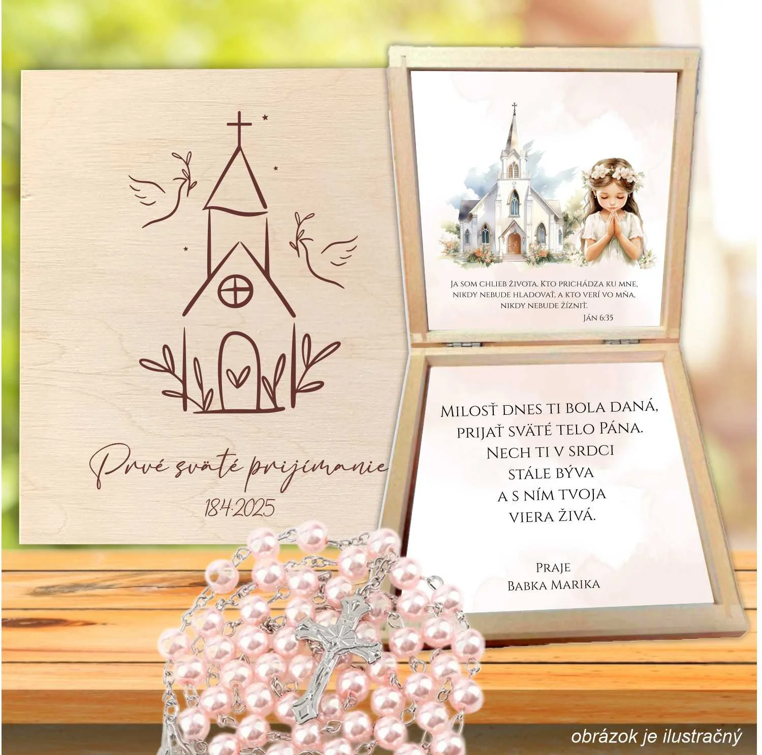 Krabička je vyrobená z kvalitného materiálu, zdobená jemným motívom a osobným venovaním, ktoré môžete prispôsobiť podľa želania. Vo vnútri sa nachádza ruženec – symbol viery a ochrany, ktorý bude sprevádzať obdarovaného počas jeho duchovnej cesty.