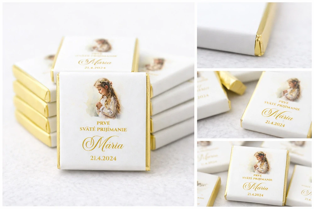Mini čokoládka s etiketou na mieru - prvé sväté prijímanie. Potešte svojich hostí originálnym darčekom v rôznych motívoch a farebných prevedeniach, ktoré sa budú skvele hodiť k Vašej výzdobe.  Táto mini čokoládka na prvé sväté prijímanie je nielen lahodným dezertom, ale aj pekným spôsobom, ako osláv celý popis