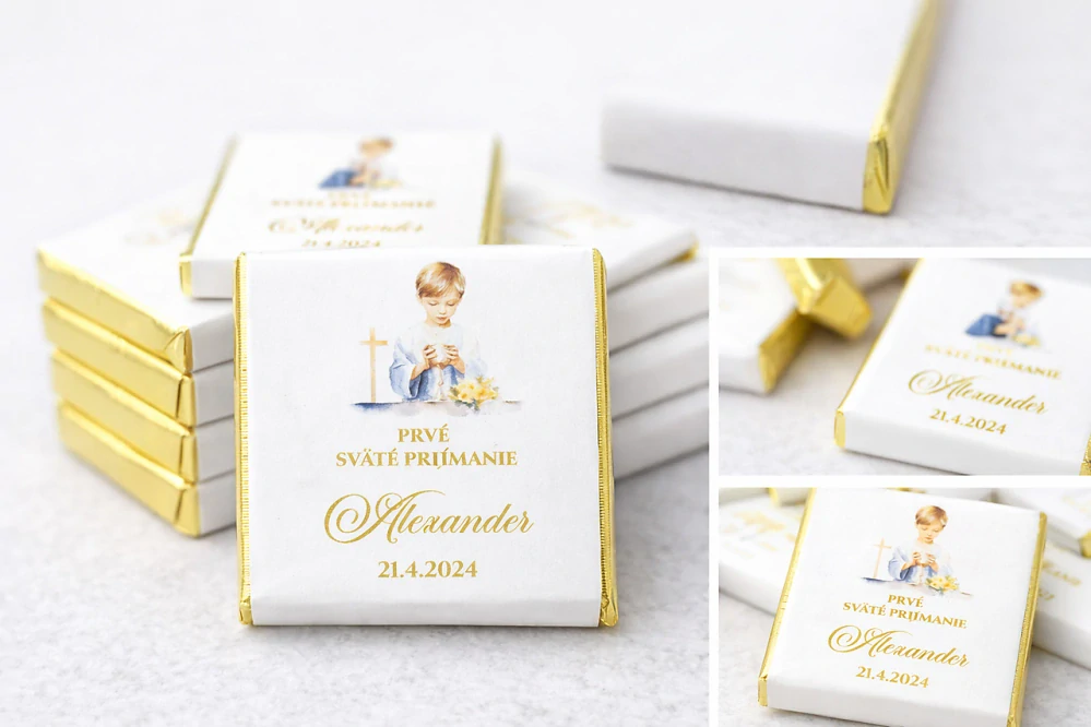 Mini čokoládka s etiketou na mieru - prvé sväté prijímanie. Potešte svojich hostí originálnym darčekom v rôznych motívoch a farebných prevedeniach, ktoré sa budú skvele hodiť k Vašej výzdobe.  Táto mini čokoládka na prvé sväté prijímanie je nielen lahodným dezertom, ale aj pekným spôsobom, ako osláv celý popis