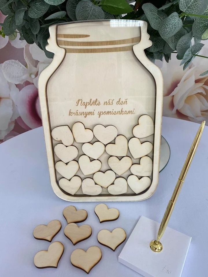 Netradičná drevená kniha pre hostí v tvare nádoby s kúskami sŕdc, na ktoré sa píšu odkazy pre mladomanželov.