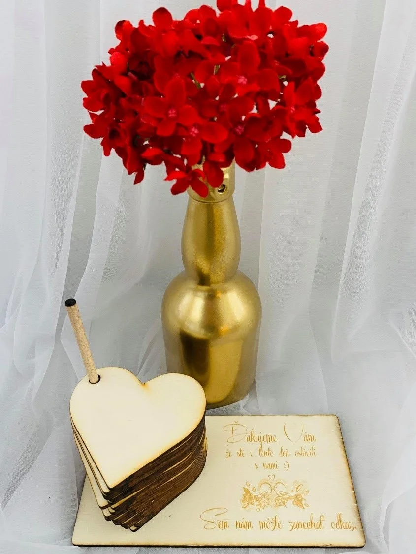 Originálne spestrenie vášho svadobného dňa v podobe tejto drevenej svadobnej knihy pre hostí. Na srdiečkach Vám svadobčania jednoducho zanechajú odkaz, ktorý sa bežne píše do tradičnej papierovej svadobnej knihy hostí.