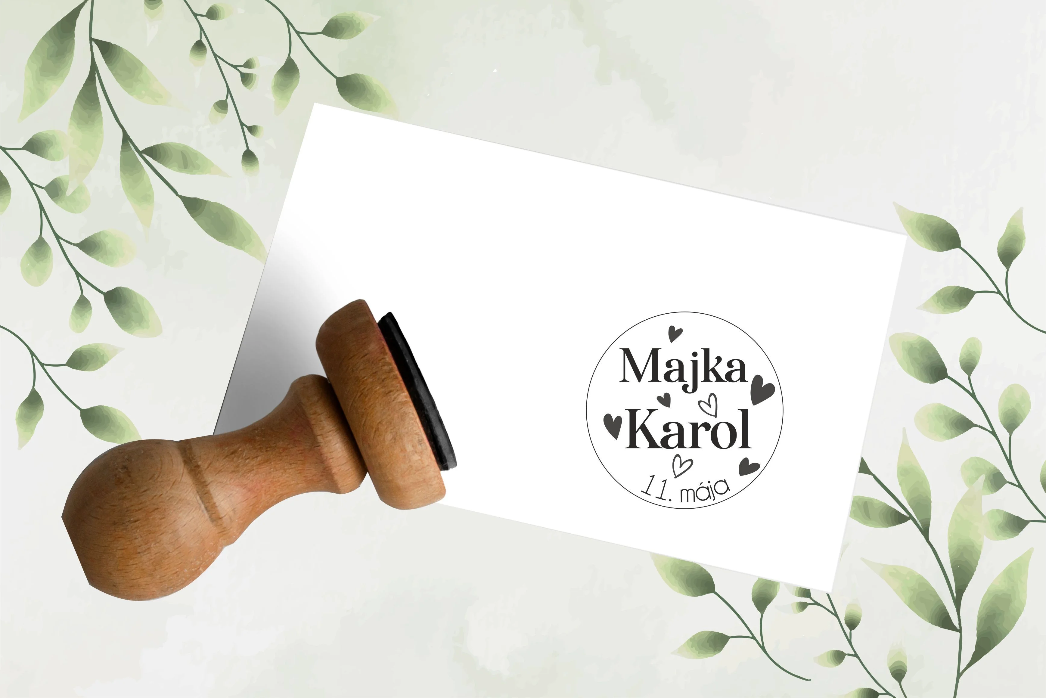 Svadobná pečiatka je vyrobená pomocou lasera. Spodná časť je vyrobená z gumy. Na túto časť sa otlačí atrament. Spodná časť pečiatky je vyrobená v rozmere 4cm. celý popis
