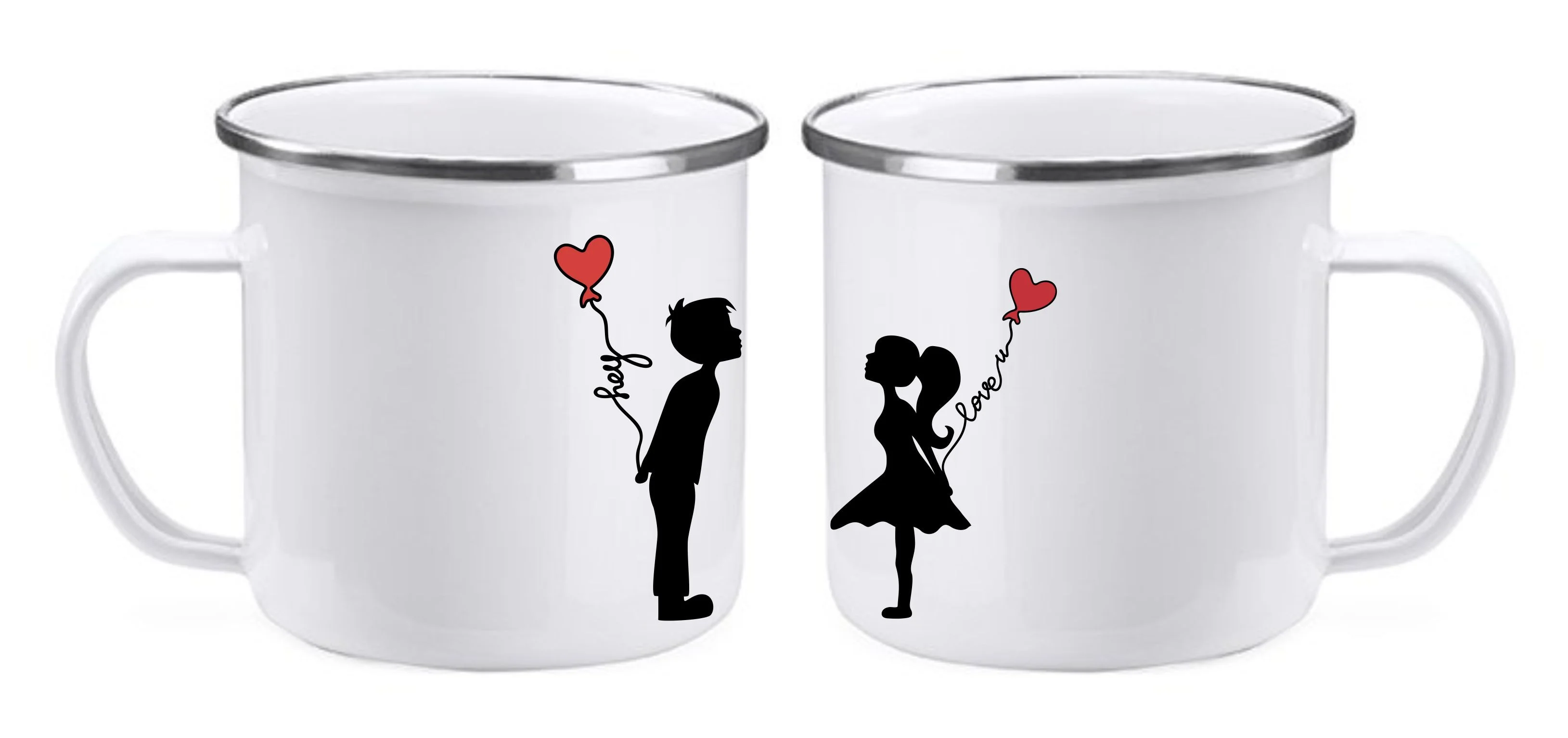 Plechové hrnčeky pre páry v bielej farbe so strieborným lemom s potlačou.