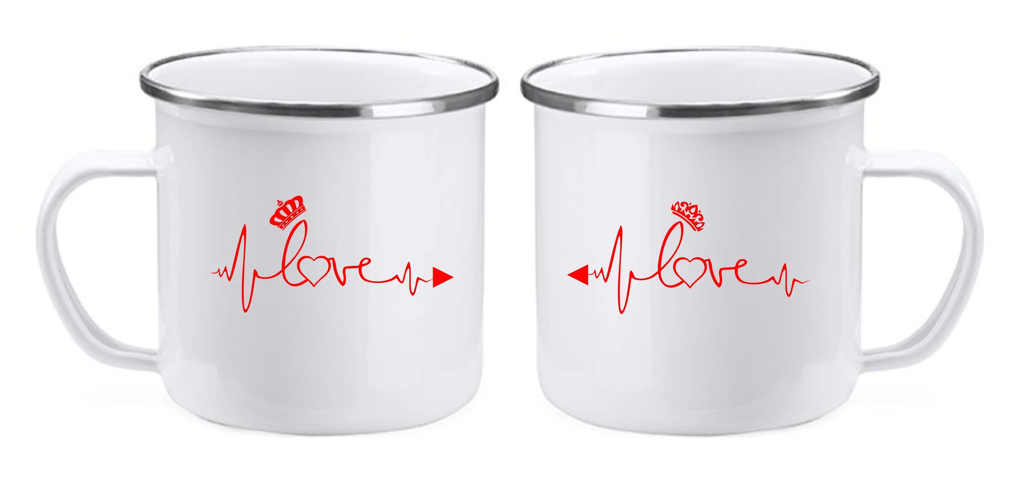 Plechové hrnčeky pre páry v bielej farbe so strieborným lemom s potlačou.