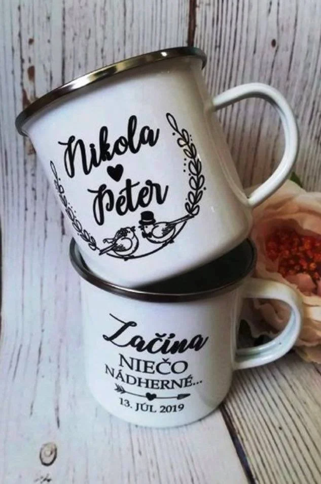 Plechové hrnčeky pre páry v bielej farbe so strieborným lemom s potlačou.