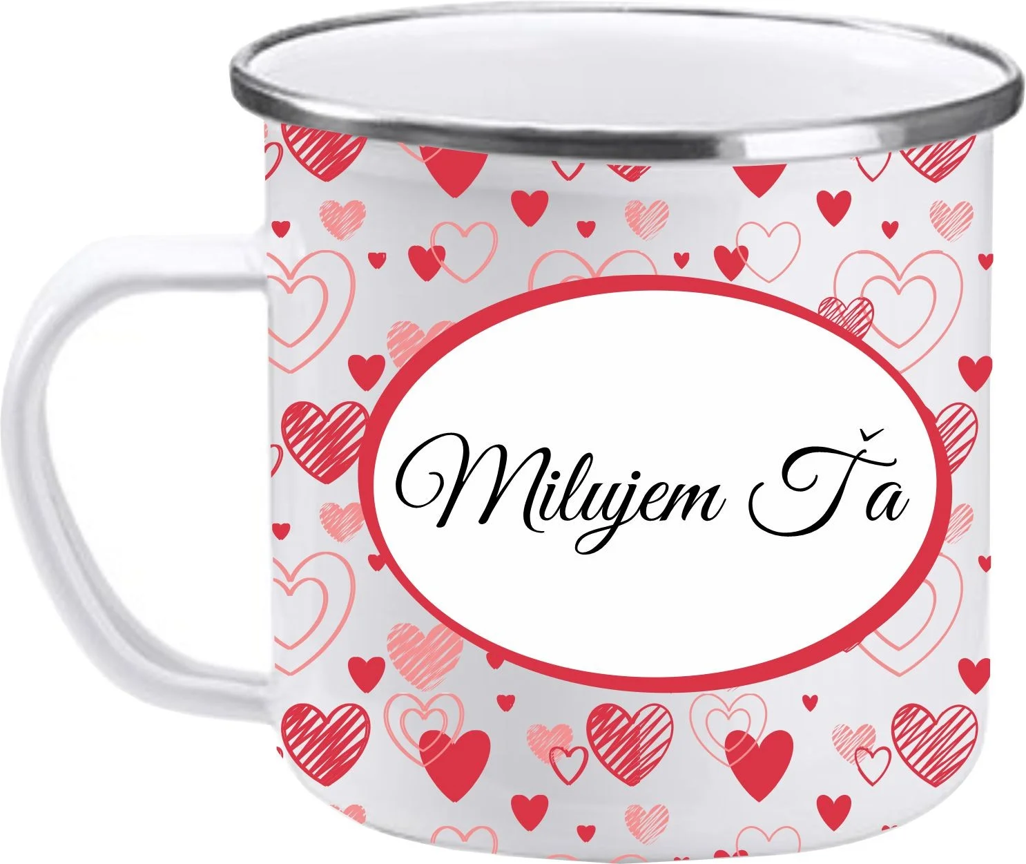 Plechový hrnček v bielej farbe so strieborným lemom s potlačou.