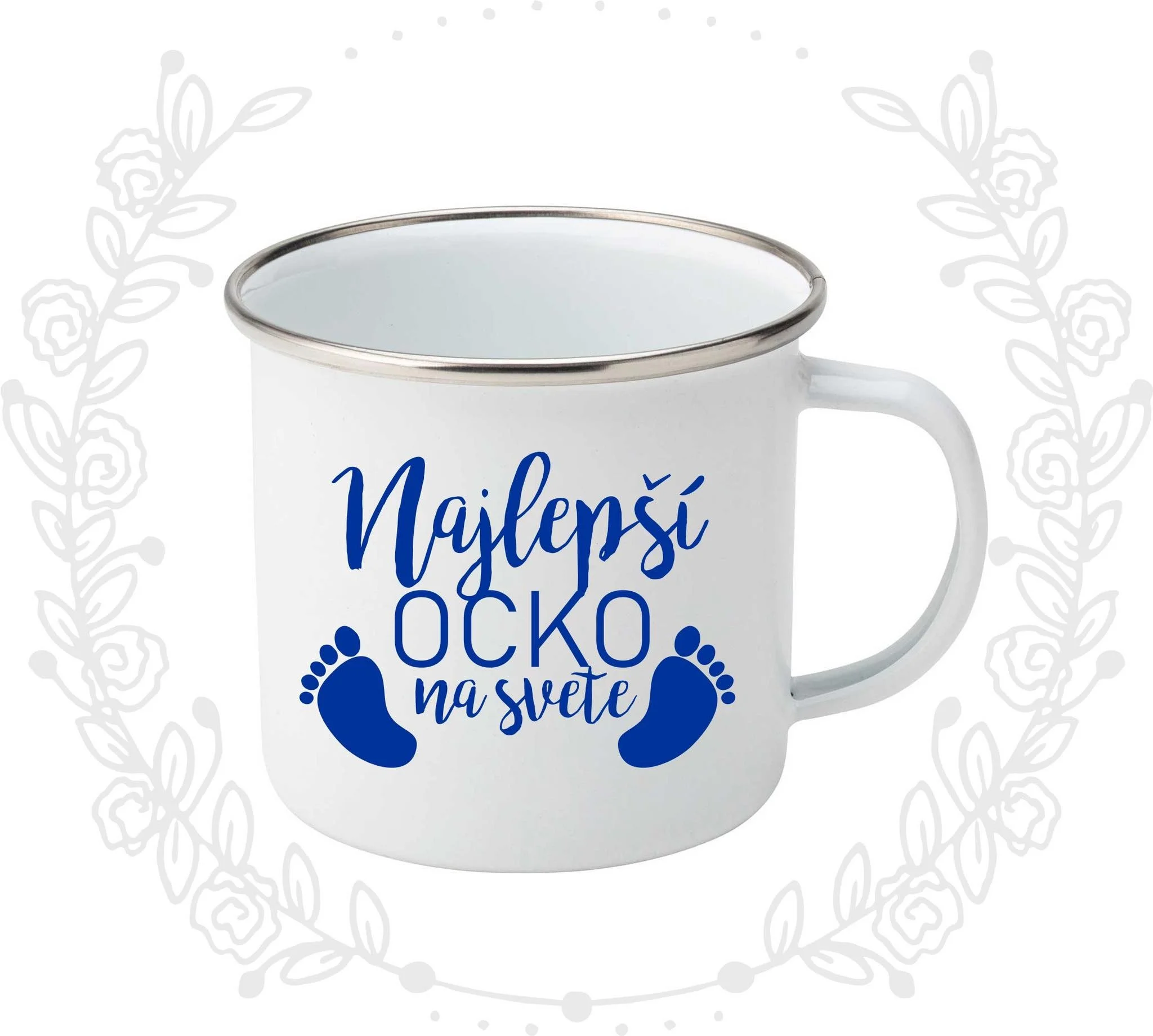 Plechový hrnček v bielej farbe so strieborným lemom s potlačou.