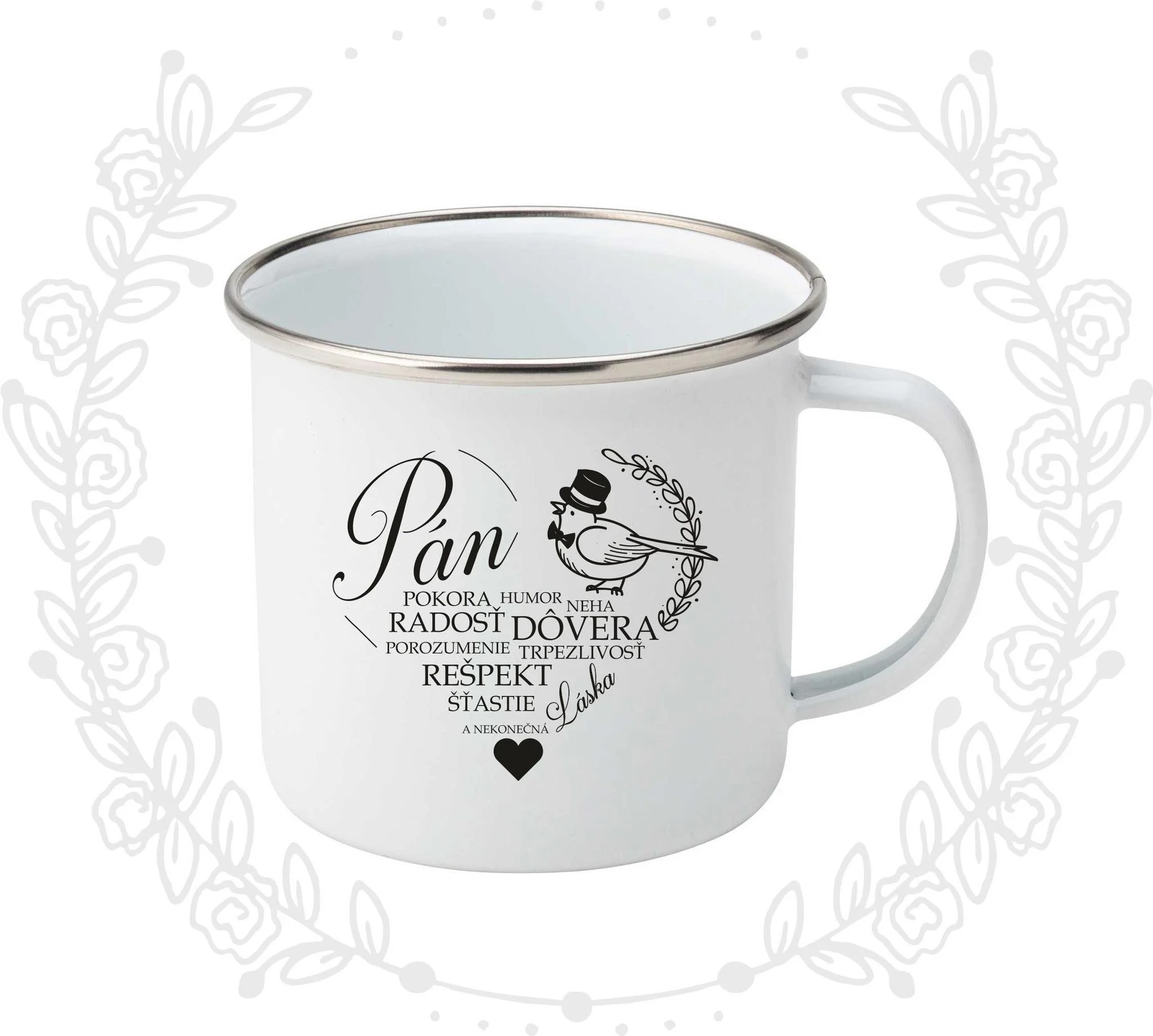 Plechový hrnček v bielej farbe so strieborným lemom s potlačou.