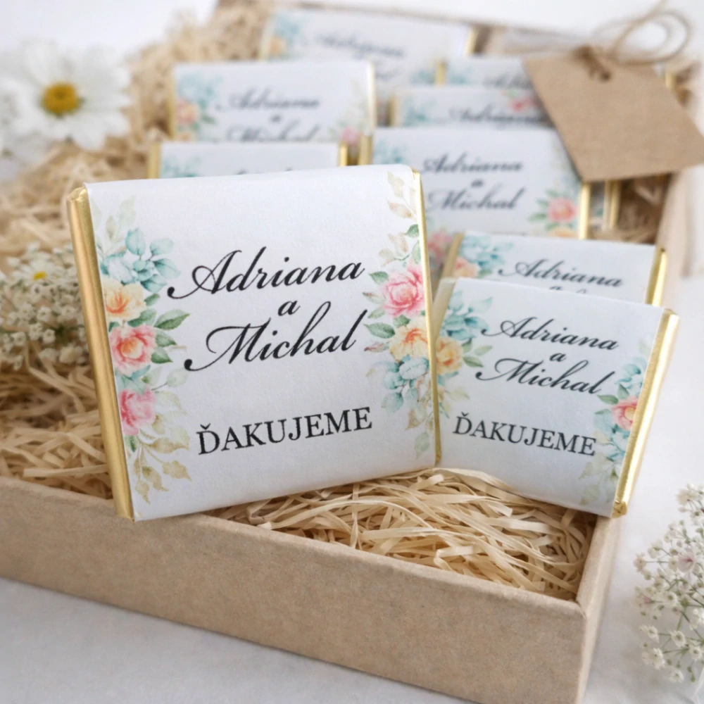 Svadobná mini čokoládka s etiketou na mieru.  Potešte svojich svadobných hostí originálnym darčekom v rôznych motívoch a farebných prevedeniach, ktoré sa budú skvele hodiť k Vašej svadobnej výzdobe.  celý popis