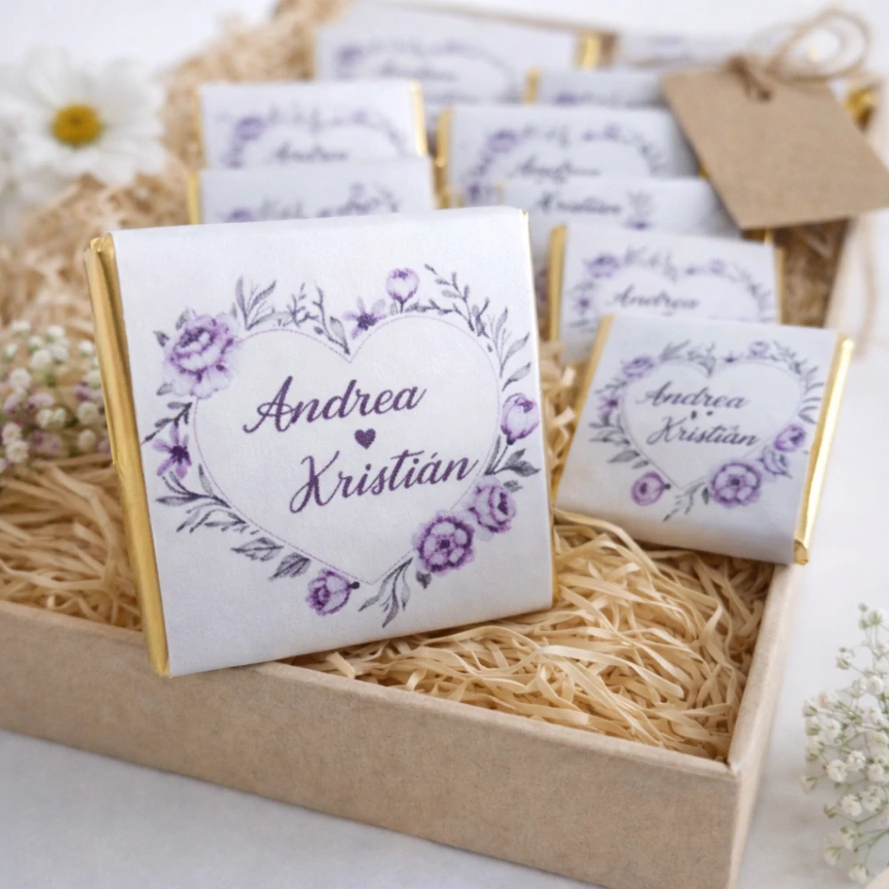 Svadobná mini čokoládka s etiketou na mieru.  Potešte svojich svadobných hostí originálnym darčekom v rôznych motívoch a farebných prevedeniach, ktoré sa budú skvele hodiť k Vašej svadobnej výzdobe.  celý popis