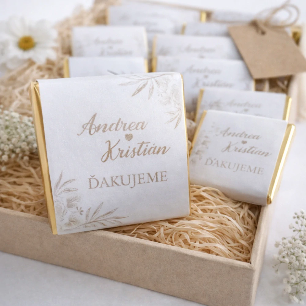 Svadobná mini čokoládka s etiketou na mieru. celý popis