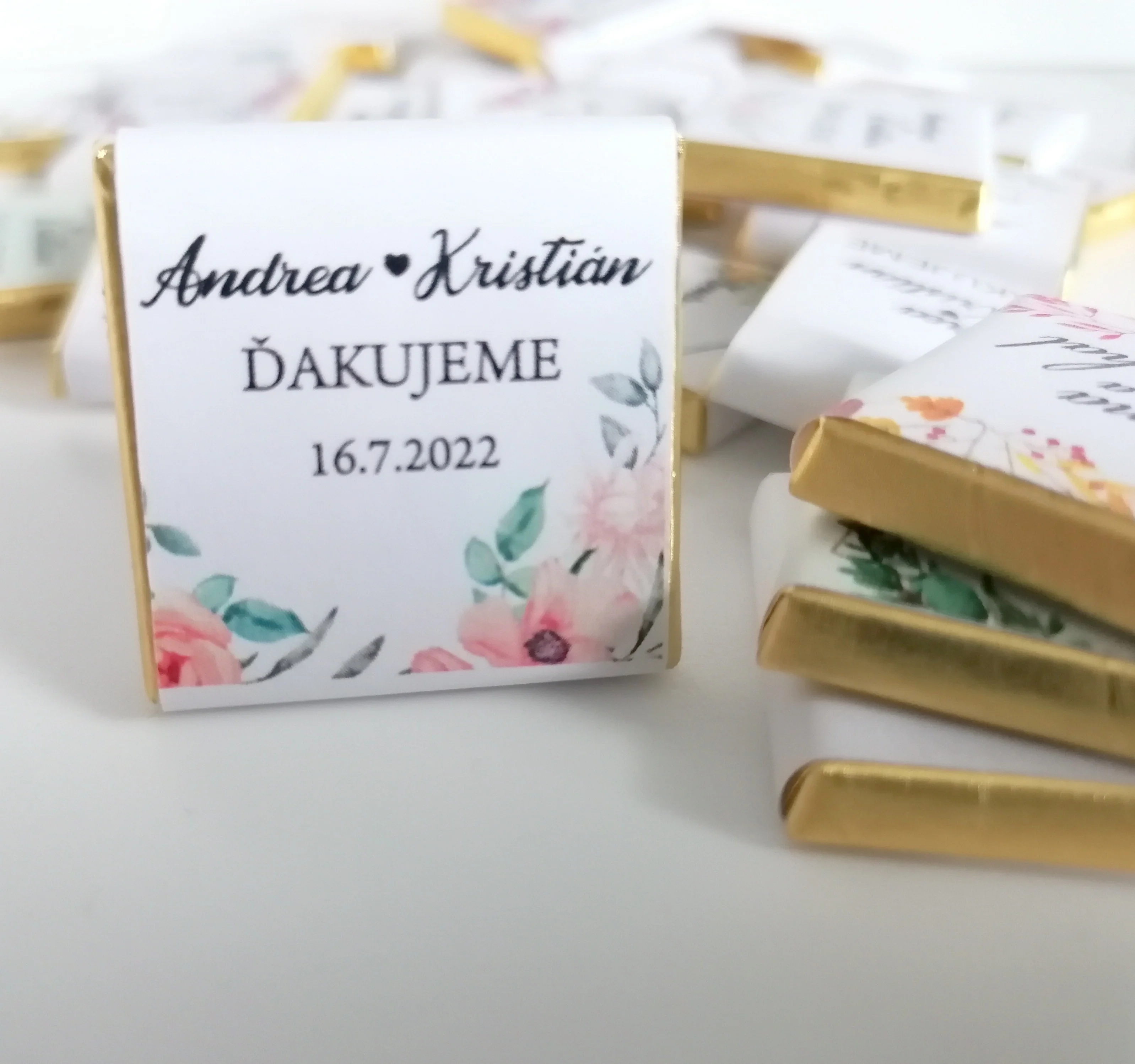 Svadobná mini čokoládka s etiketou na mieru.  Potešte svojich svadobných hostí originálnym darčekom v rôznych motívoch a farebných prevedeniach, ktoré sa budú skvele hodiť k Vašej svadobnej výzdobe.  celý popis