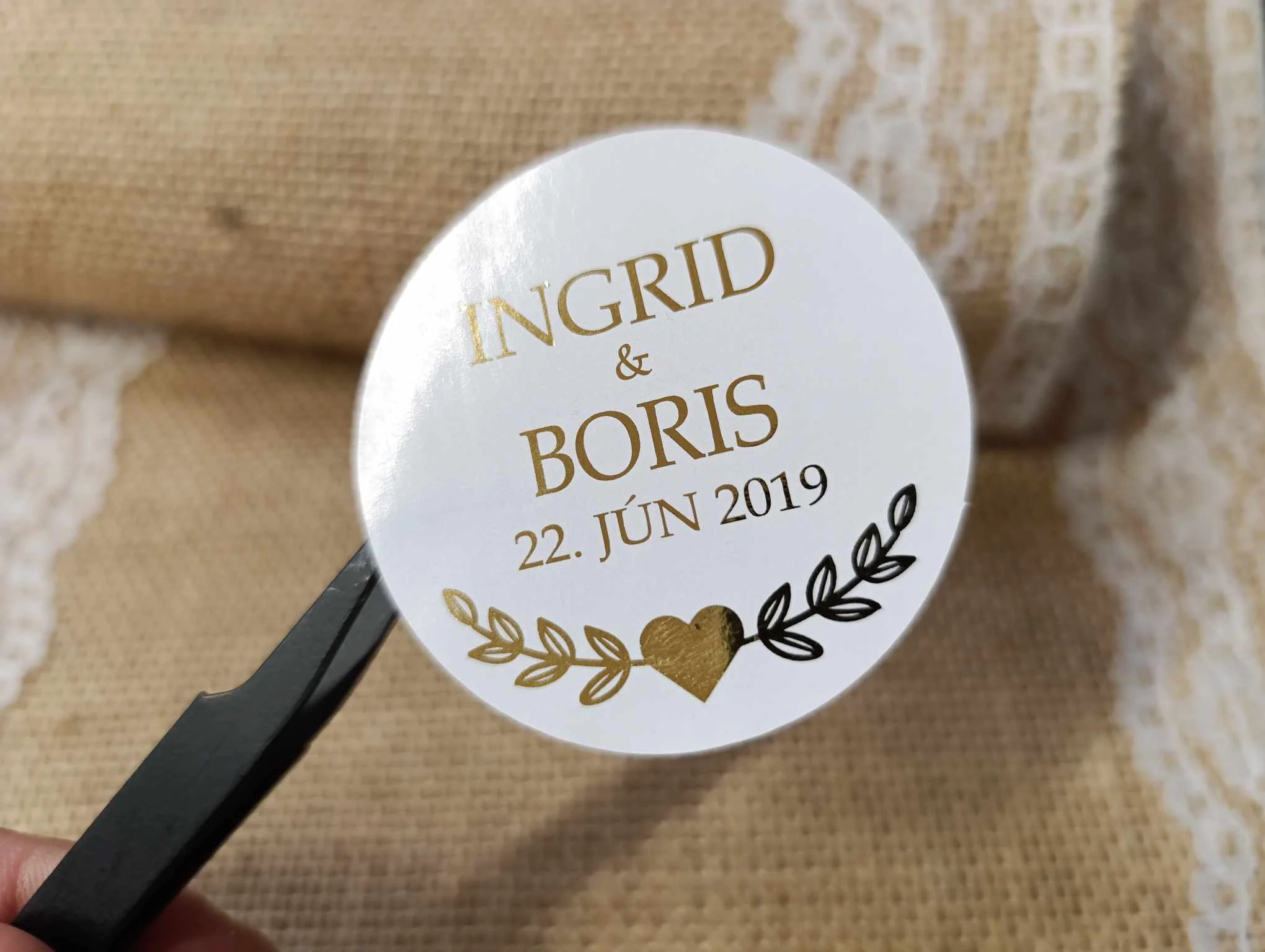 Svadobná nálepka na mieru vhodná na svadobnú výslužku - zlatá metalická potlač. Ak by ste mali iné celý popis