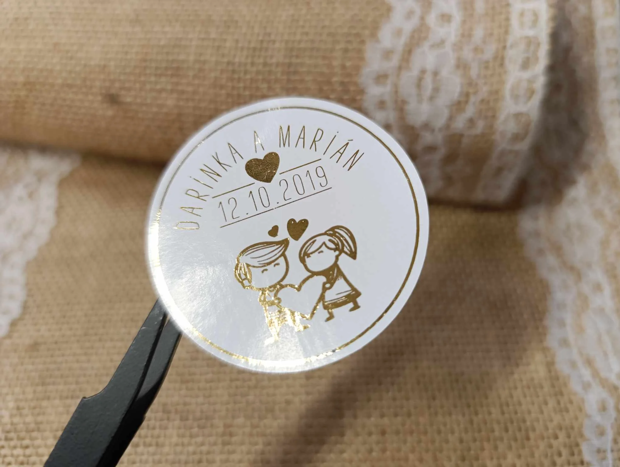 Svadobná nálepka na mieru vhodná na svadobnú výslužku - zlatá metalická potlač. Ak by ste mali iné celý popis