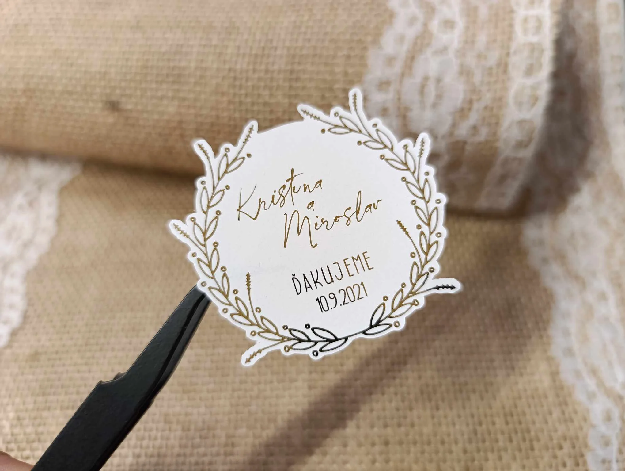 Svadobná nálepka na mieru vhodná na svadobnú výslužku - zlatá metalická potlač. Ak by ste mali iné celý popis