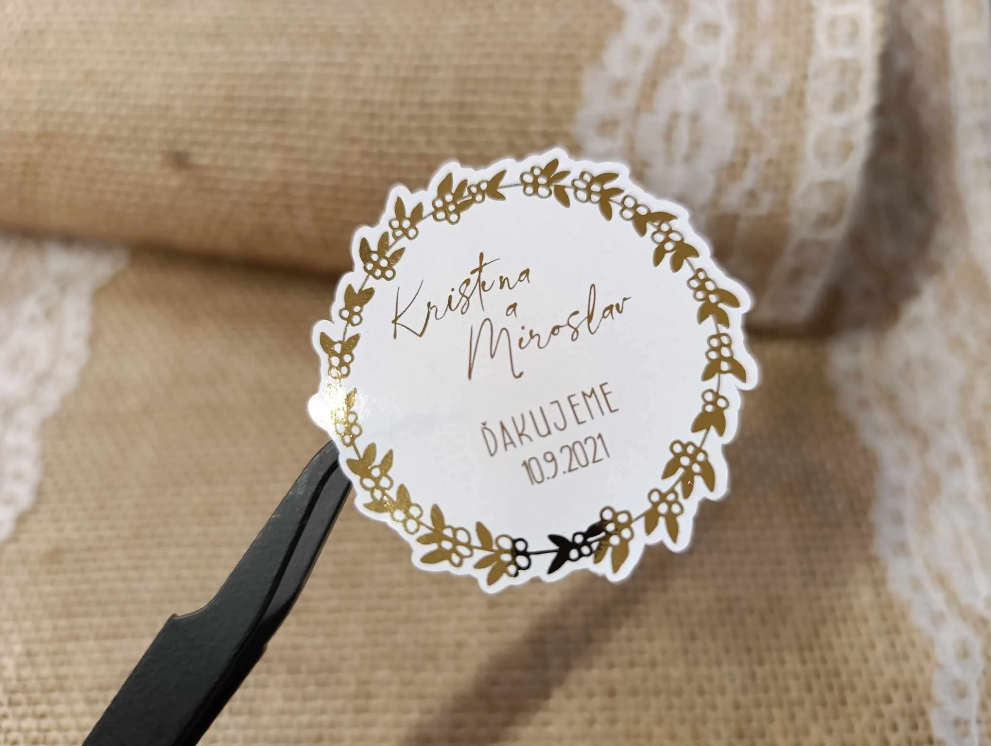 Svadobná nálepka na mieru vhodná na svadobnú výslužku - zlatá metalická potlač. Ak by ste mali iné celý popis
