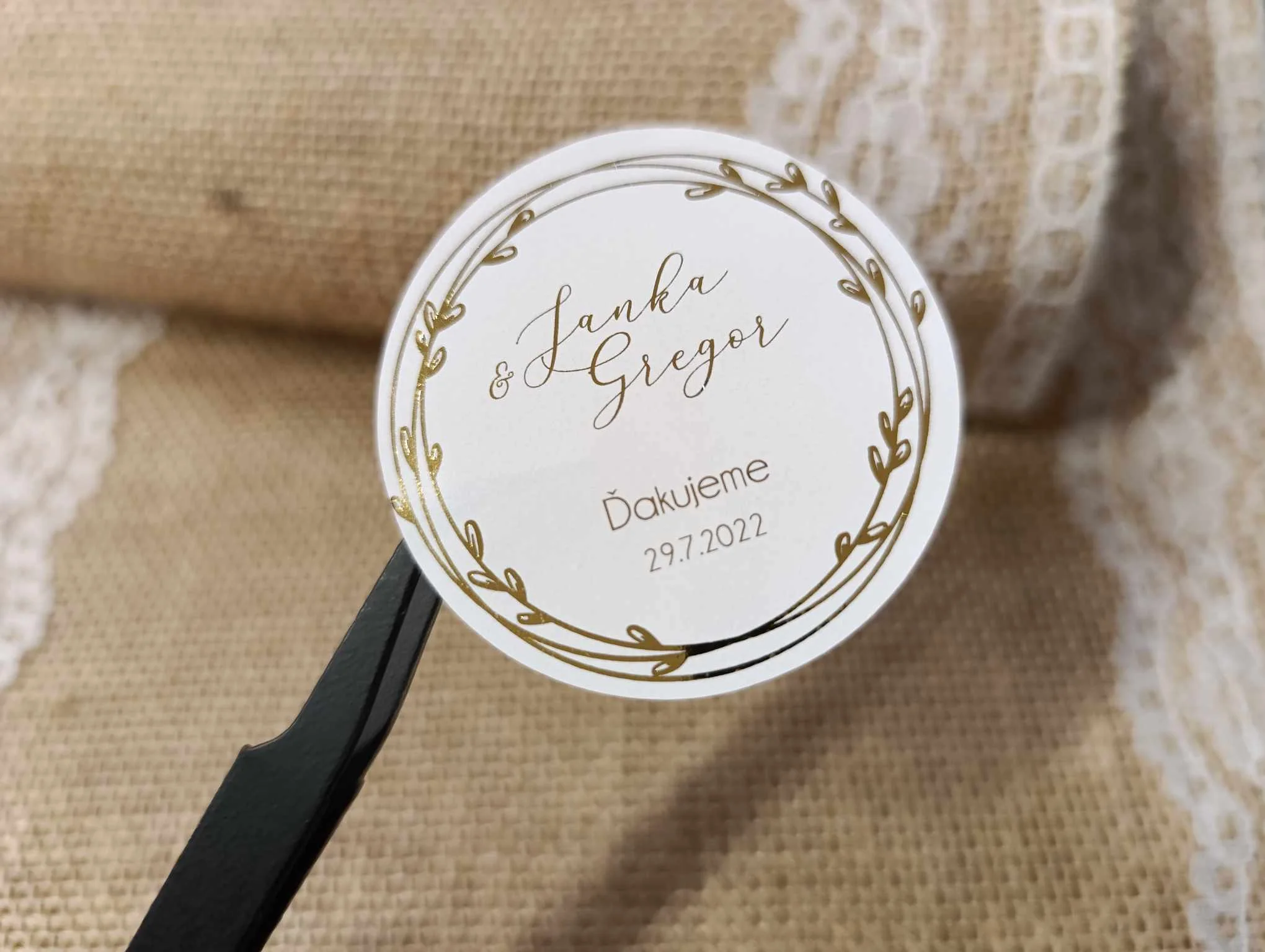 Svadobná nálepka na mieru vhodná na svadobnú výslužku - zlatá metalická potlač. Ak by ste mali iné celý popis
