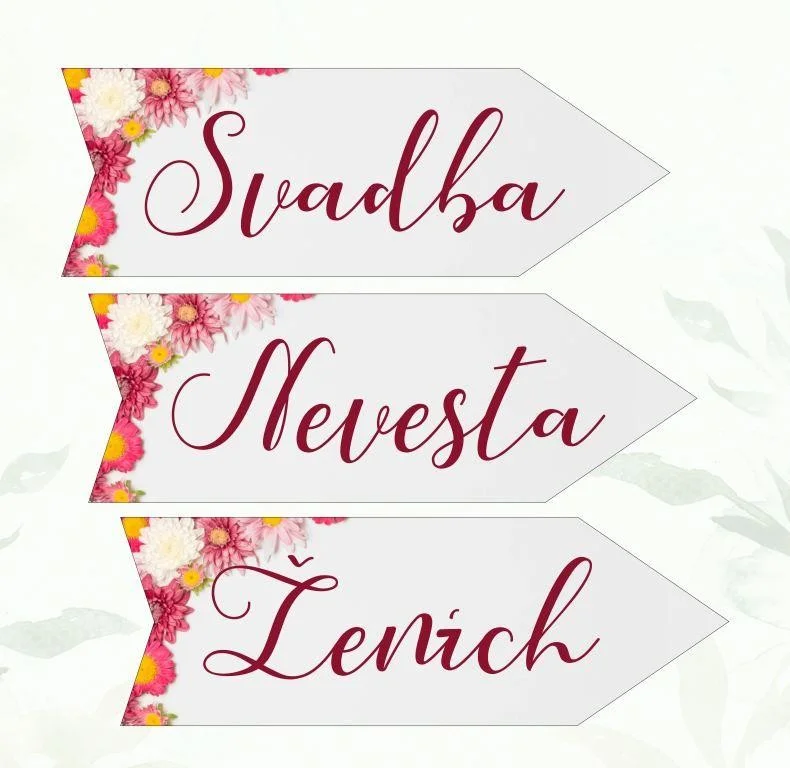 Svadobná tabuľka v tvare šípky. Cena je uvedená pre 1 ks šípky. Vyberte nápis (svadba/ženích/nevesta) na šípke, smer celý popis