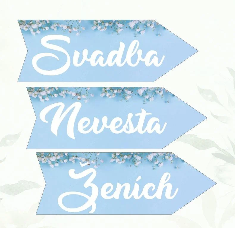 Svadobná tabuľka v tvare šípky. Cena je uvedená pre 1 ks šípky. Vyberte nápis (svadba/ženích/nevesta) na šípke, smer celý popis