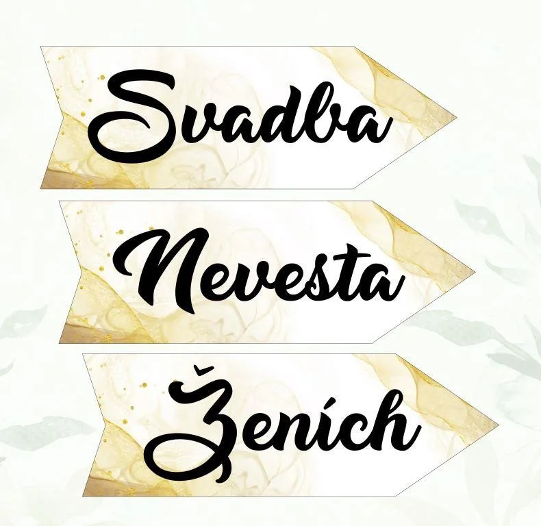 Svadobná tabuľka v tvare šípky. Cena je uvedená pre 1 ks šípky. Vyberte nápis (svadba/ženích/nevesta) na šípke, smer celý popis