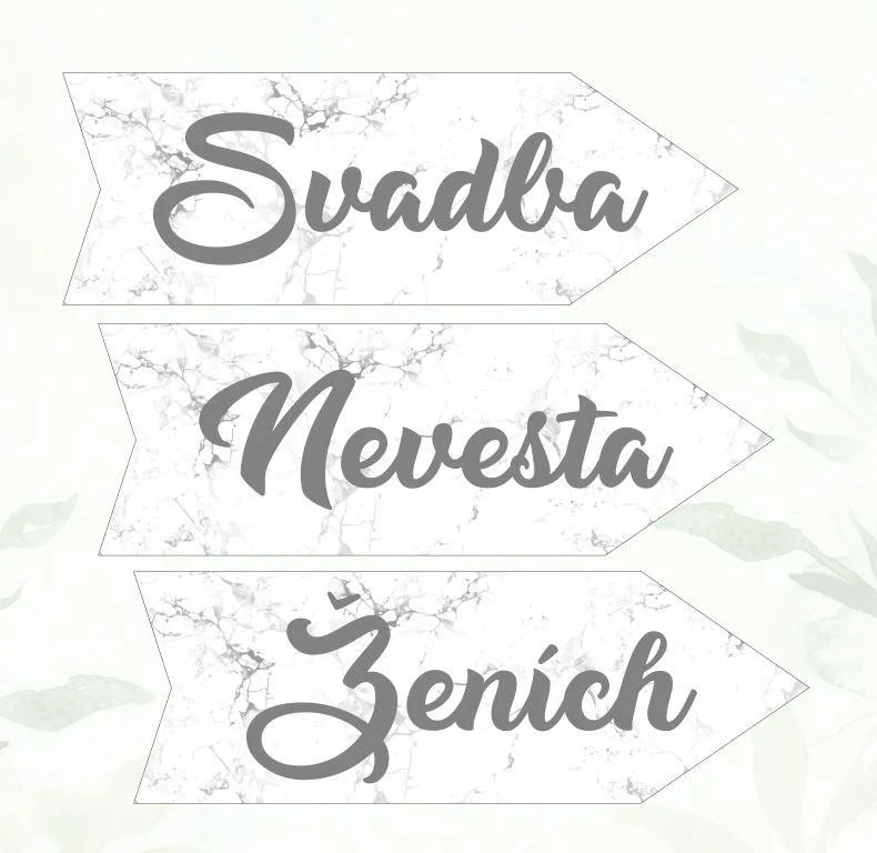 Svadobná tabuľka v tvare šípky. Cena je uvedená pre 1 ks šípky. Vyberte nápis (svadba/ženích/nevesta) na šípke, smer celý popis