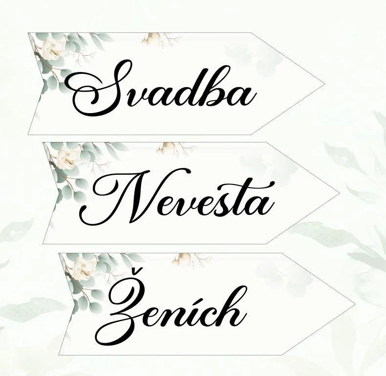 Svadobná tabuľka v tvare šípky. Cena je uvedená pre 1 ks šípky. Vyberte nápis (svadba/ženích/nevesta) na šípke, smer celý popis