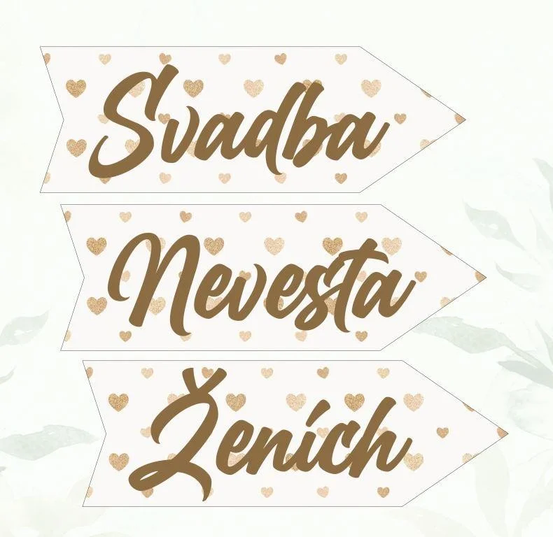 Svadobná tabuľka v tvare šípky. Cena je uvedená pre 1 ks šípky. Vyberte nápis (svadba/ženích/nevesta) na šípke, smer celý popis