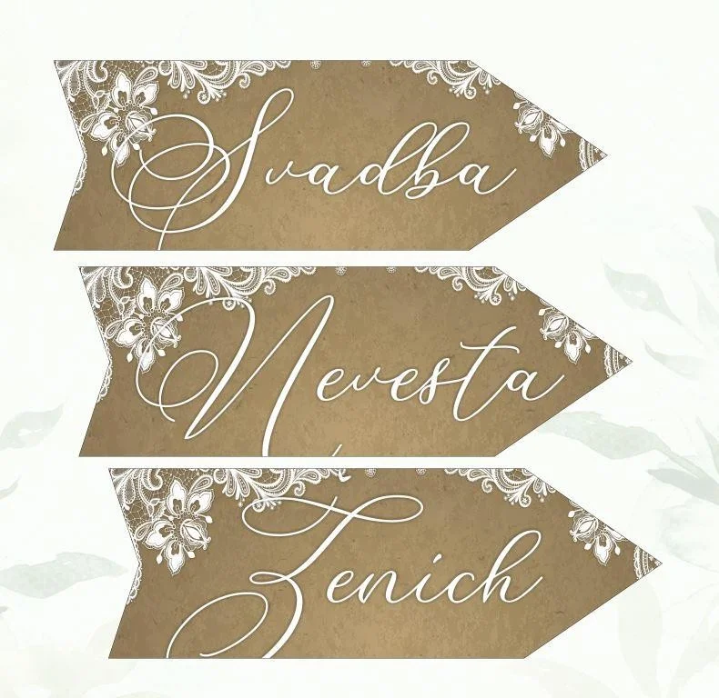 Svadobná tabuľka v tvare šípky. Cena je uvedená pre 1 ks šípky. Vyberte nápis (svadba/ženích/nevesta) na šípke, smer celý popis