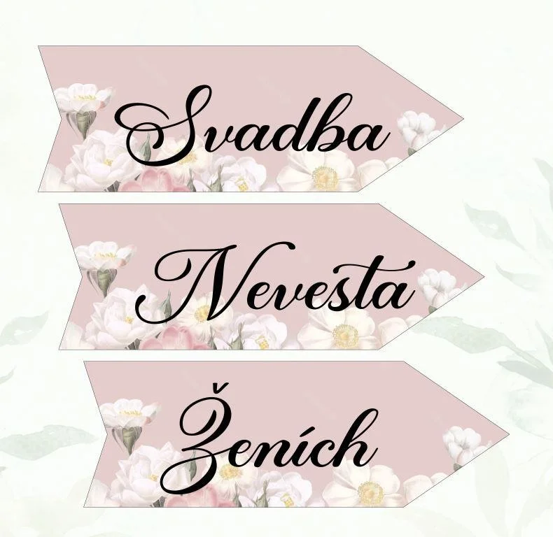 Svadobná tabuľka v tvare šípky. Cena je uvedená pre 1 ks šípky. Vyberte nápis (svadba/ženích/nevesta) na šípke, smer celý popis