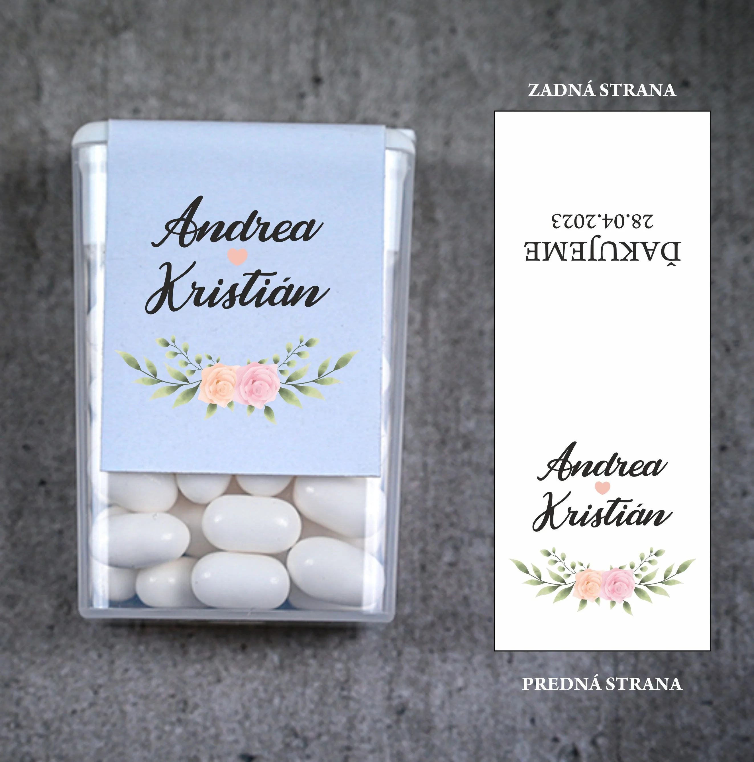 Originálne svadobné Tic Tac s personalizovanou etiketou sú skvelým a praktickým darčekom pre vašich svadobných hostí. Malé mentolové cukríky v elegantnom balení osviežia dych a zároveň budú milou spomienkou na váš veľký deň. Obal je možné prispôsobiť menami nevesty a ženícha, dátumom svadby alebo vami zvoleným motívom, aby dokonale ladil s vašou svadobnou výzdobou.