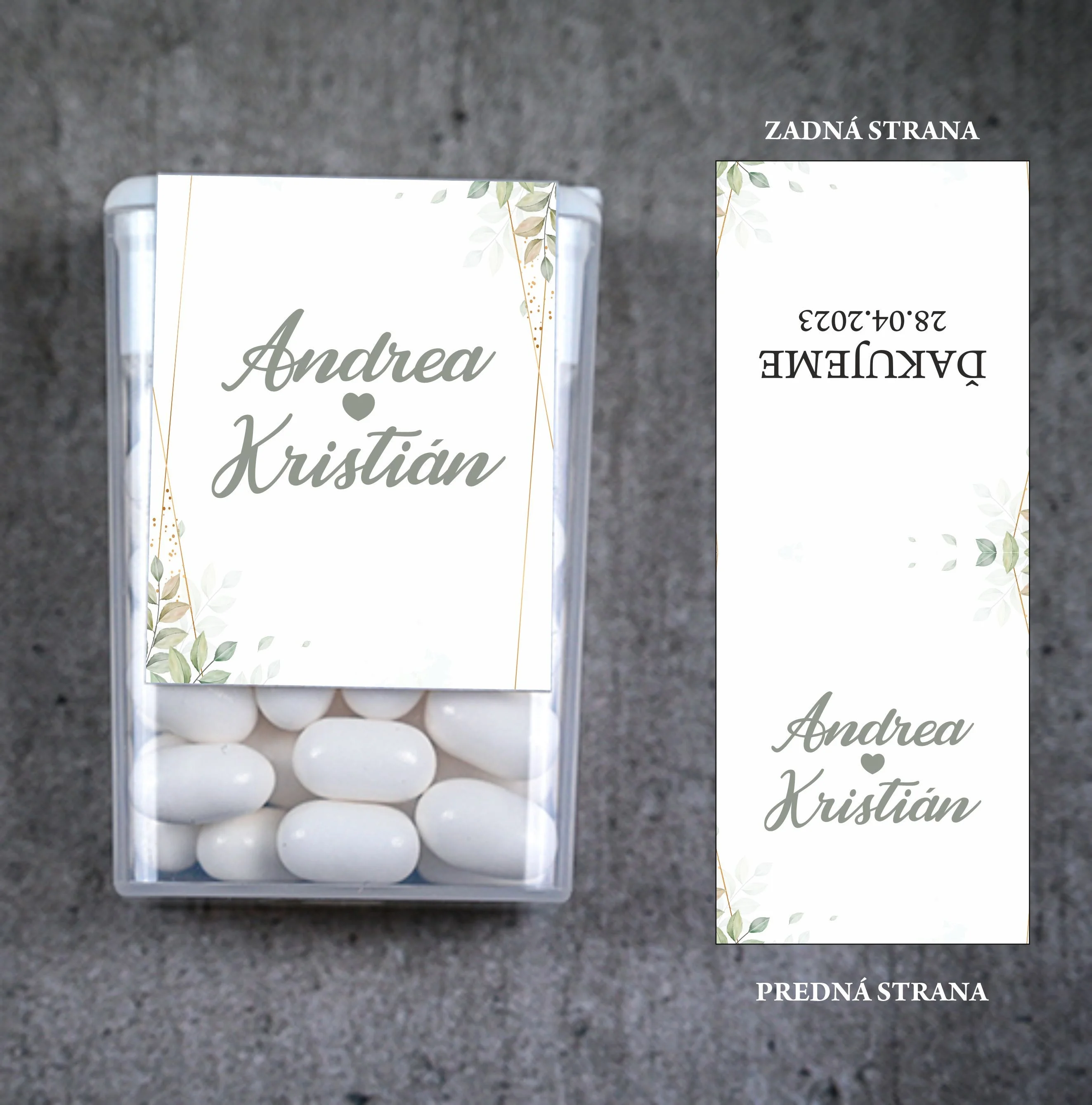 Originálne svadobné Tic Tac s personalizovanou etiketou sú skvelým a praktickým darčekom pre vašich svadobných hostí. Malé mentolové cukríky v elegantnom balení osviežia dych a zároveň budú milou spomienkou na váš veľký deň. Obal je možné prispôsobiť menami nevesty a ženícha, dátumom svadby alebo vami zvoleným motívom, aby dokonale ladil s vašou svadobnou výzdobou.