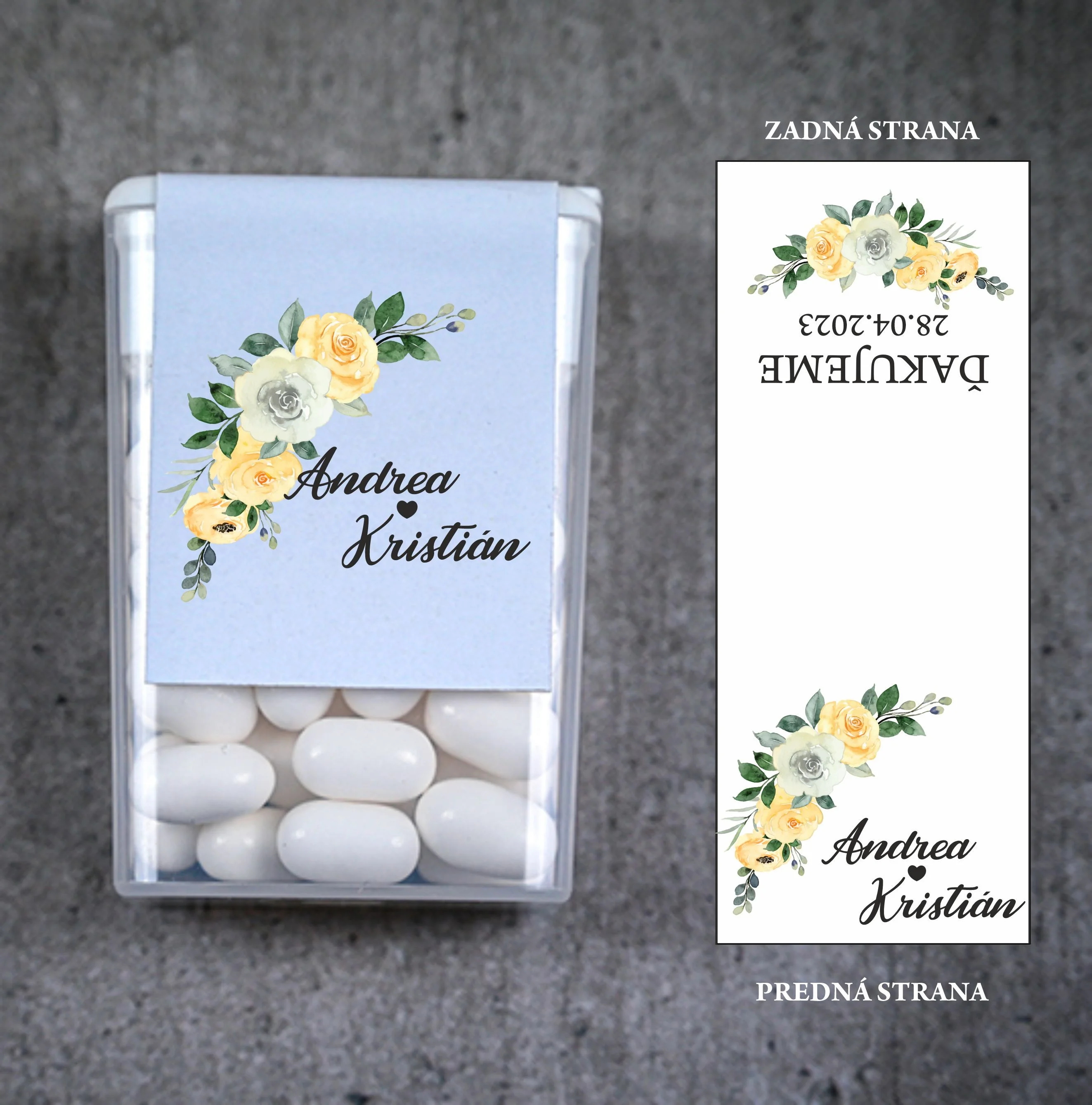 Originálne svadobné Tic Tac s personalizovanou etiketou sú skvelým a praktickým darčekom pre vašich svadobných hostí. Malé mentolové cukríky v elegantnom balení osviežia dych a zároveň budú milou spomienkou na váš veľký deň. Obal je možné prispôsobiť menami nevesty a ženícha, dátumom svadby alebo vami zvoleným motívom, aby dokonale ladil s vašou svadobnou výzdobou.