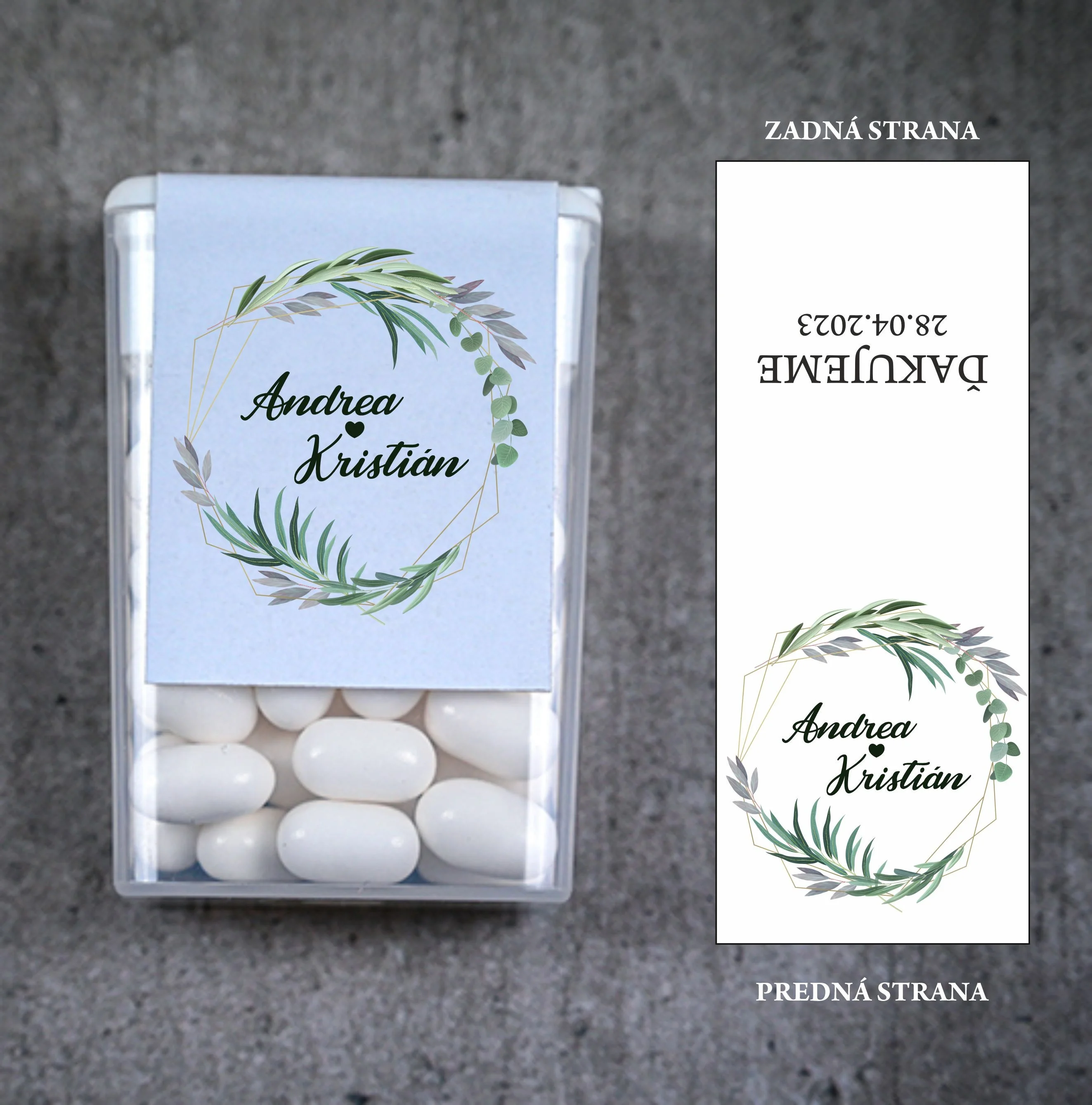 Originálne svadobné Tic Tac s personalizovanou etiketou sú skvelým a praktickým darčekom pre vašich svadobných hostí. Malé mentolové cukríky v elegantnom balení osviežia dych a zároveň budú milou spomienkou na váš veľký deň. Obal je možné prispôsobiť menami nevesty a ženícha, dátumom svadby alebo vami zvoleným motívom, aby dokonale ladil s vašou svadobnou výzdobou.