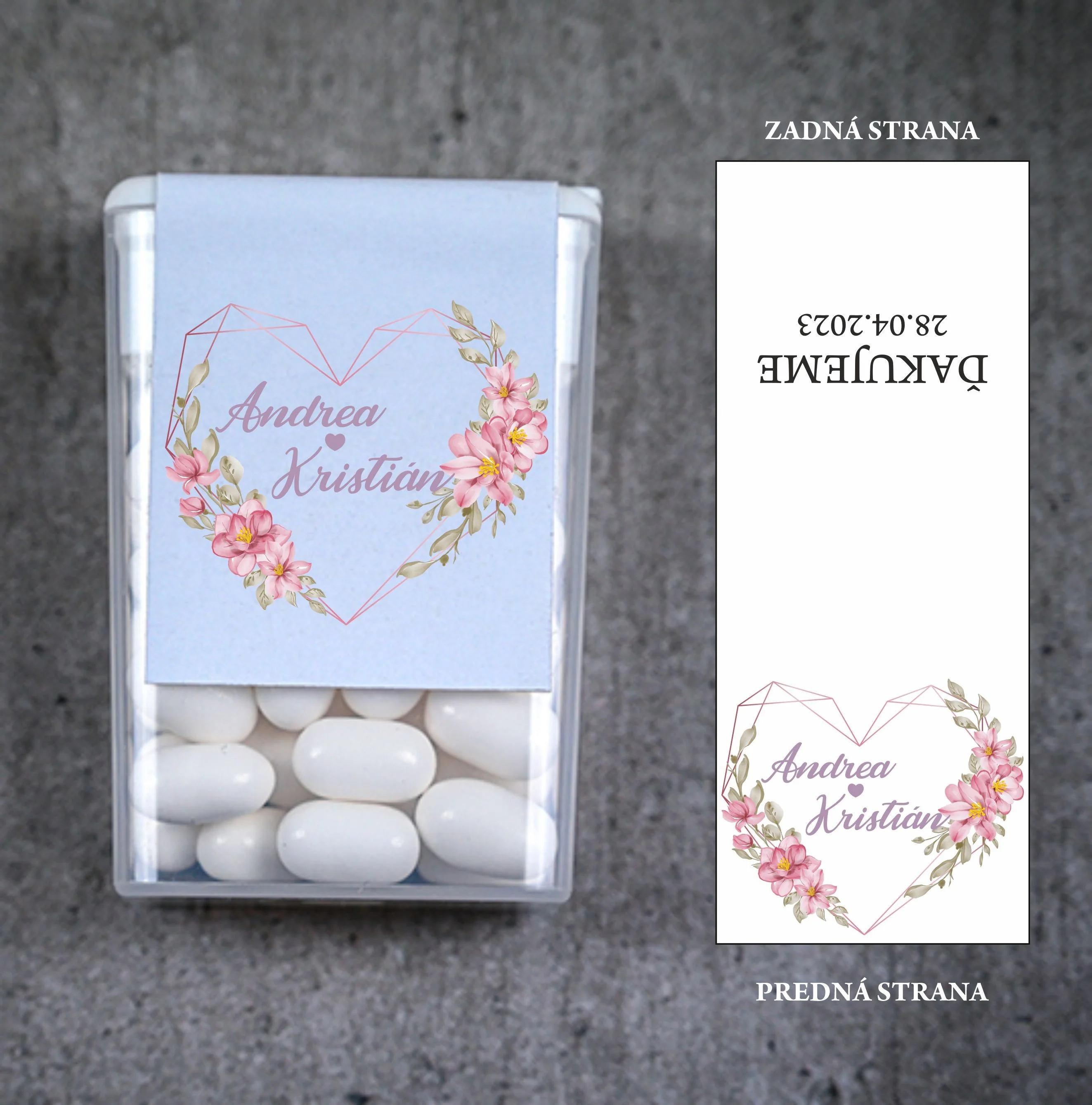 Originálne svadobné Tic Tac s personalizovanou etiketou sú skvelým a praktickým darčekom pre vašich svadobných hostí. Malé mentolové cukríky v elegantnom balení osviežia dych a zároveň budú milou spomienkou na váš veľký deň. Obal je možné prispôsobiť menami nevesty a ženícha, dátumom svadby alebo vami zvoleným motívom, aby dokonale ladil s vašou svadobnou výzdobou.