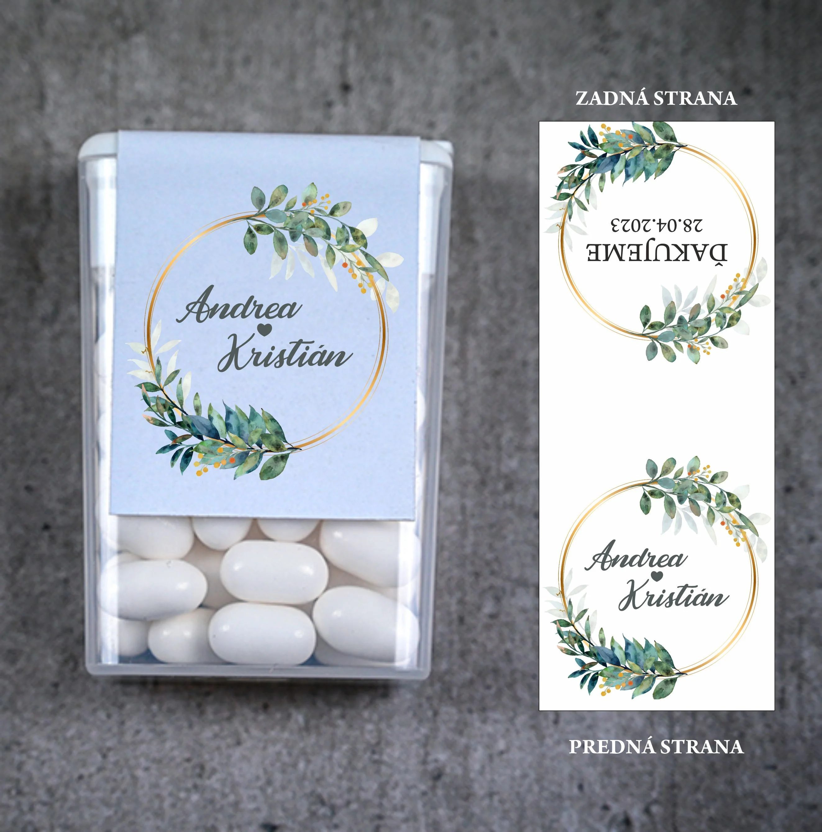 Originálne svadobné Tic Tac s personalizovanou etiketou sú skvelým a praktickým darčekom pre vašich svadobných hostí. Malé mentolové cukríky v elegantnom balení osviežia dych a zároveň budú milou spomienkou na váš veľký deň. Obal je možné prispôsobiť menami nevesty a ženícha, dátumom svadby alebo vami zvoleným motívom, aby dokonale ladil s vašou svadobnou výzdobou.
