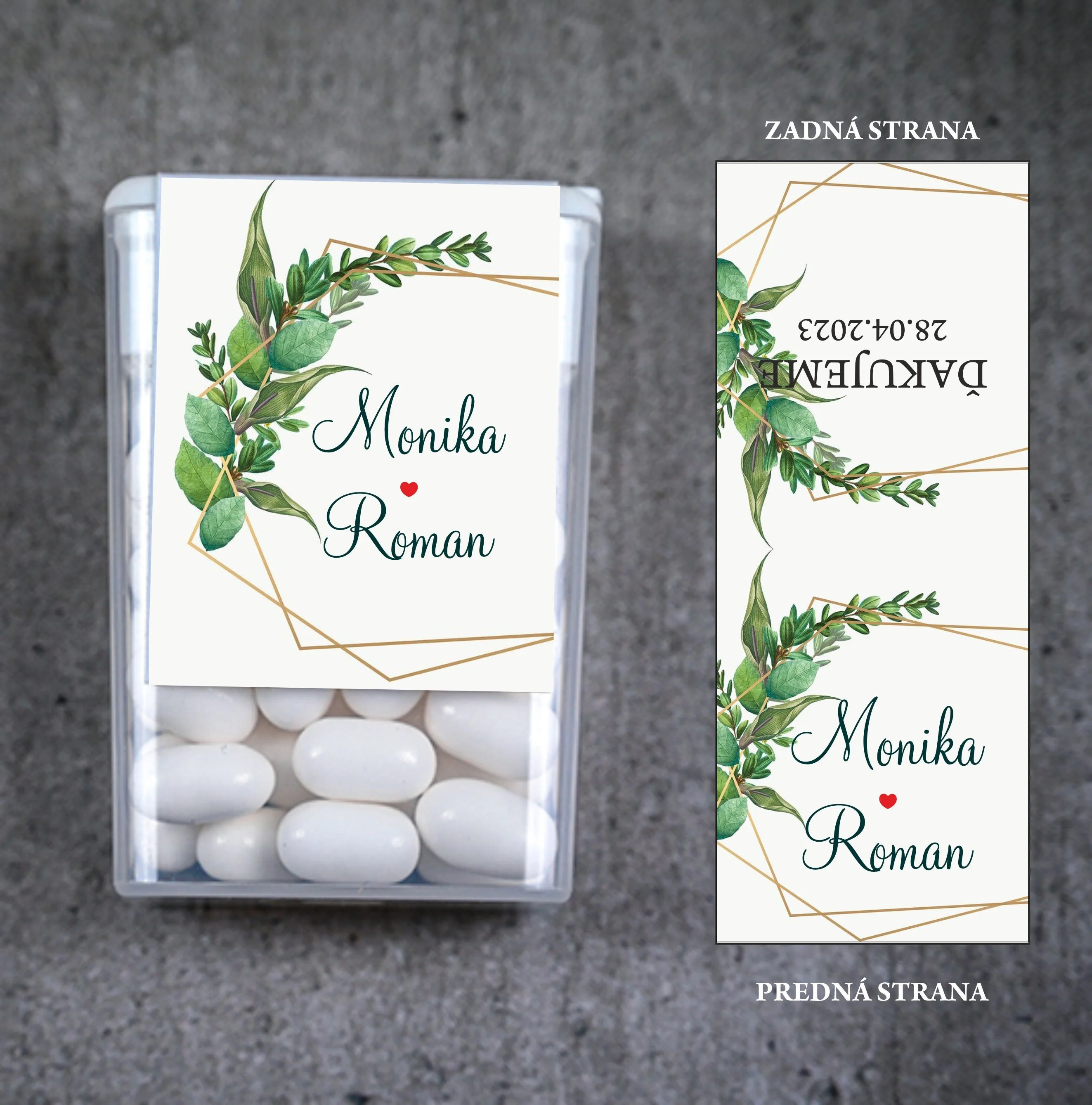 Originálne svadobné Tic Tac s personalizovanou etiketou sú skvelým a praktickým darčekom pre vašich svadobných hostí. Malé mentolové cukríky v elegantnom balení osviežia dych a zároveň budú milou spomienkou na váš veľký deň. Obal je možné prispôsobiť menami nevesty a ženícha, dátumom svadby alebo vami zvoleným motívom, aby dokonale ladil s vašou svadobnou výzdobou.
