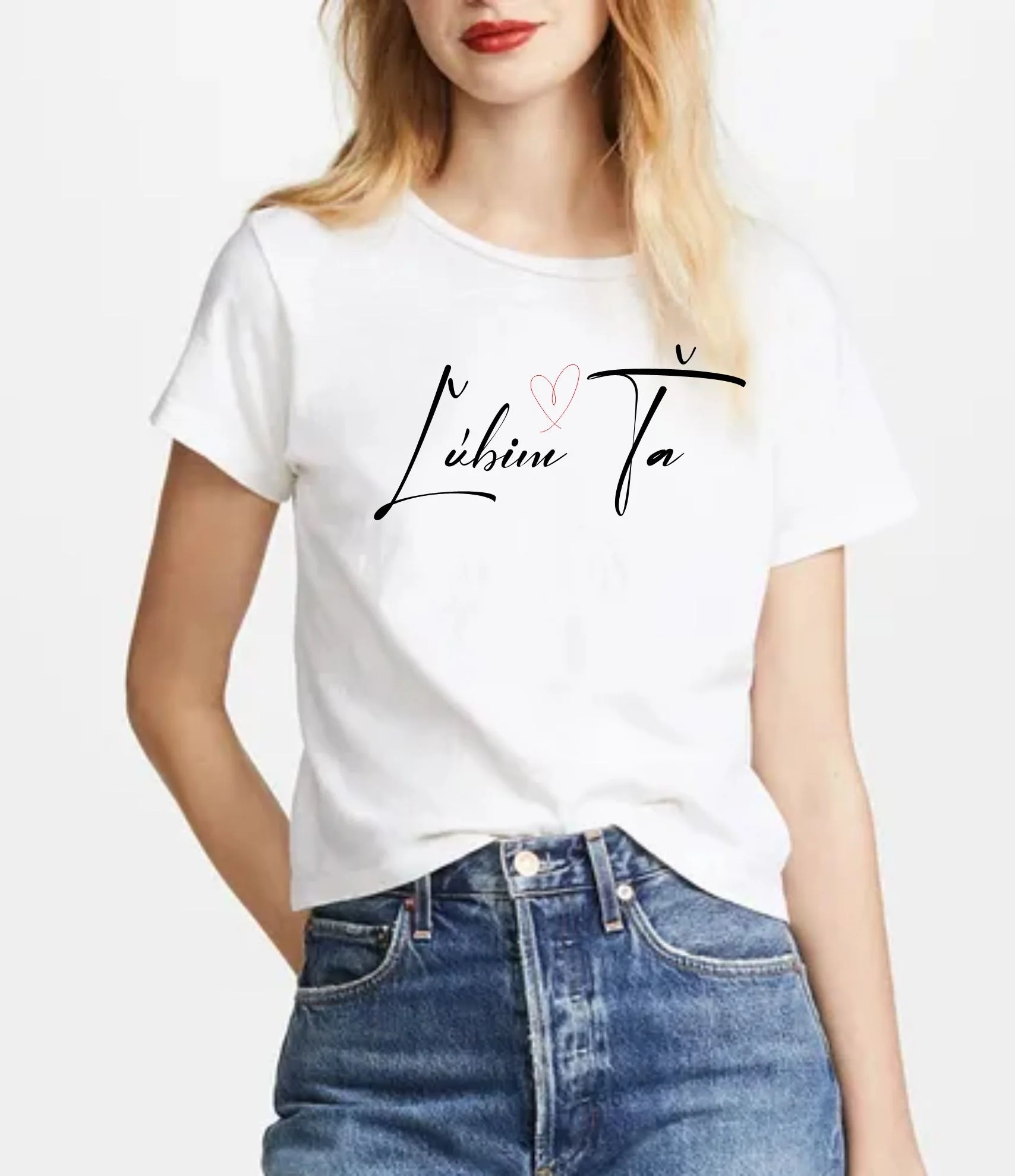 Dámske tričko s potlačeným textom ĽÚBIM ŤA v bielej farbe. celý popis