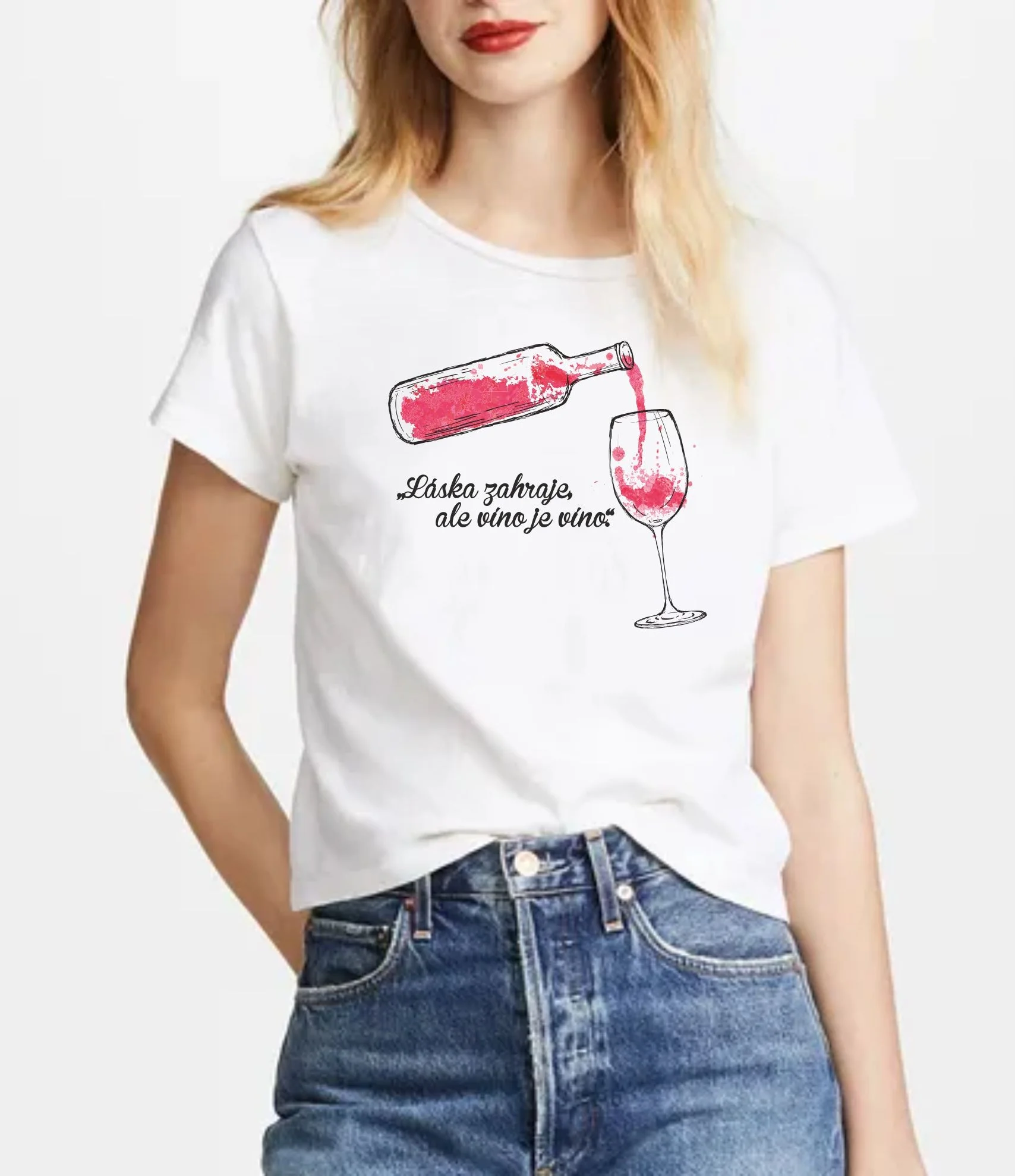 Vtipné dámske tričko s potlačeným textom LÁSKA ZAHREJE ALE VÍNO JE VÍNO v bielej farbe. celý popis
