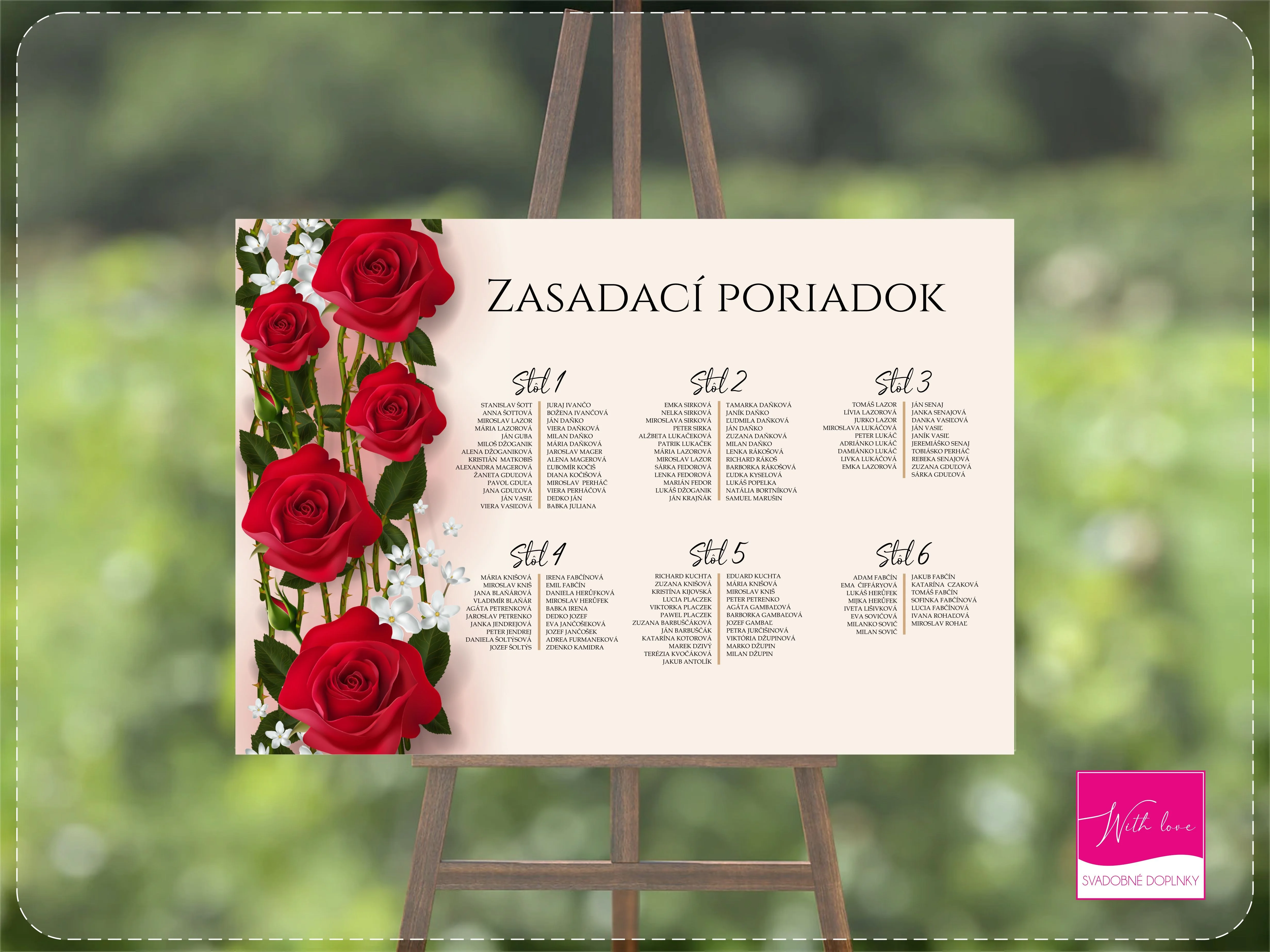 Zasadací poriadok je dôležitým artiklom pri organizovaní svadieb, ktoré sú väčšieho charakteru. Umožní hosťom správne sa zorientovať. S radosťou pre vás spracujeme aj v rovnakom motíve ako vaše ostatné tlačoviny a to nie len na svadbu ale aj akúkoľvek inú oslavu. A3 - šírka 42 cm / 29,7 cm ( S ) A2 celý popis