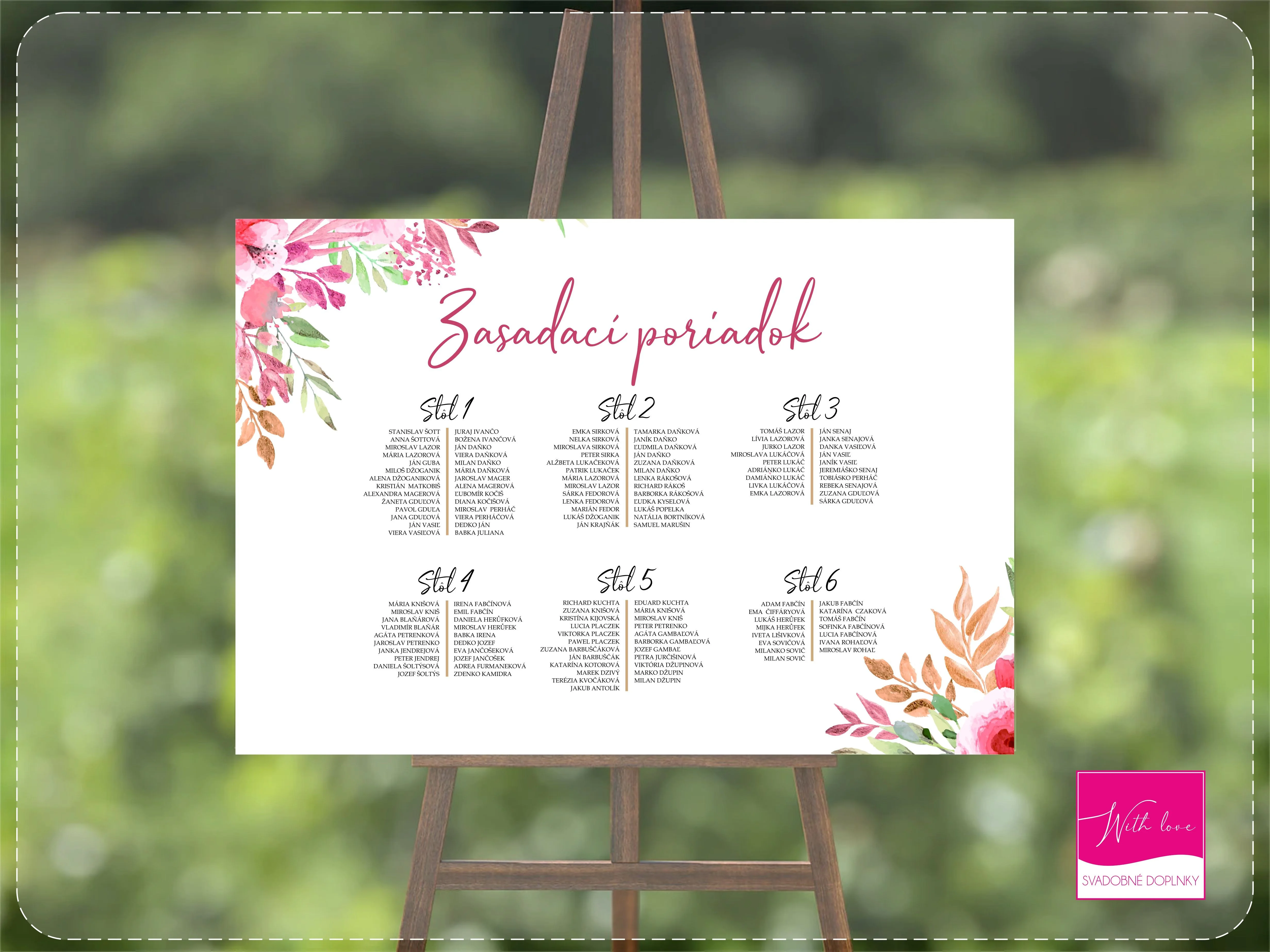 Zasadací poriadok je dôležitým artiklom pri organizovaní svadieb, ktoré sú väčšieho charakteru. Umožní hosťom správne sa zorientovať. S radosťou pre vás spracujeme aj v rovnakom motíve ako vaše ostatné tlačoviny a to nie len na svadbu ale aj akúkoľvek inú oslavu. A3 - šírka 42 cm / 29,7 cm ( S ) A2 celý popis